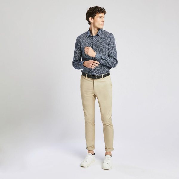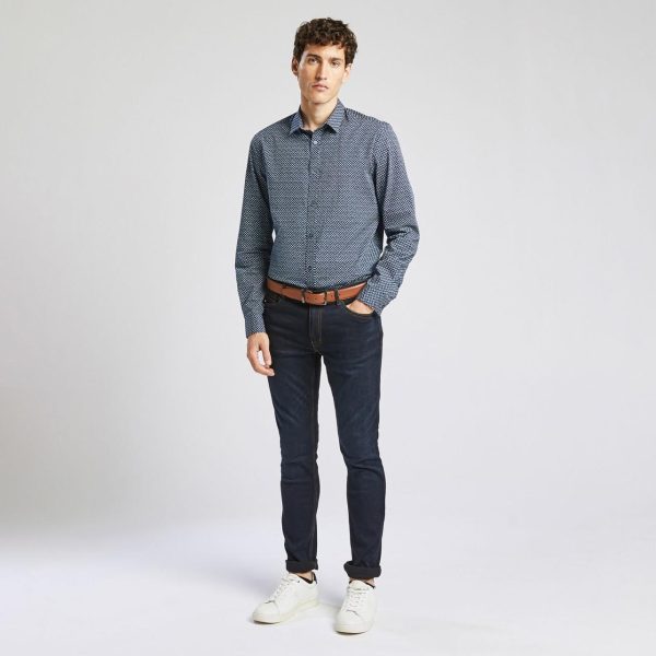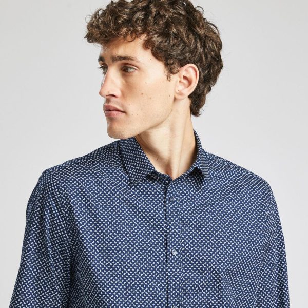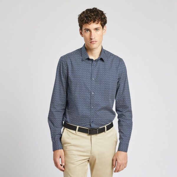 Cette chemise à manches longues en coton, imprimée fantaisie all-over, possède un col classique et renforcé par une bande thermocollante permettant de garantir un maintien optimal de celui-ci, des boutons en bas de manches et des plis d’aisance au dos. Sa coupe est slim, pour un porté près du corps.